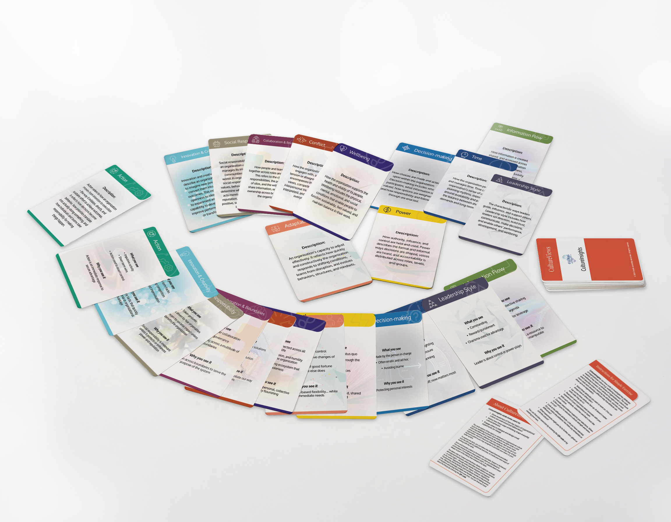 CultureViews makes the hidden patterns of organizational culture visible. Through four decks of versatile cards, CultureViews helps leaders, coaches and teams uncover the thinking frameworks shaping how people act, decide and work together – sparking meaningful conversations, revealing what’s really going on and offering practical experiments for change.